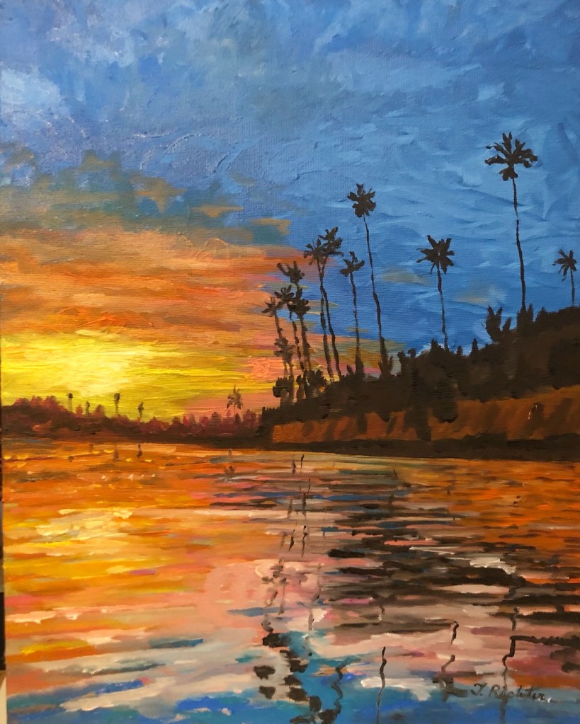- What is your inspiration? I have traveled through thirty countries viewing various art and grew up in California; therefore I paint a variety of subjects and find influence on the journey thus far.